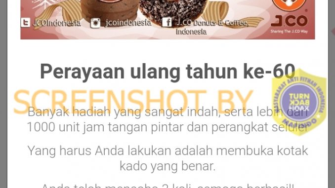 Telah beredar pesan berantai yang memuat sebuah link dengan mengatasnamakan J.CO Donuts & Coffee Indonesia atas pemberian 1000 jam tangan pintar serta perangkat seluler bagi para konsumen dalam rangka memperingati perayaan ulang tahun J.CO Donuts & Coffe Indonesia yang ke-60.