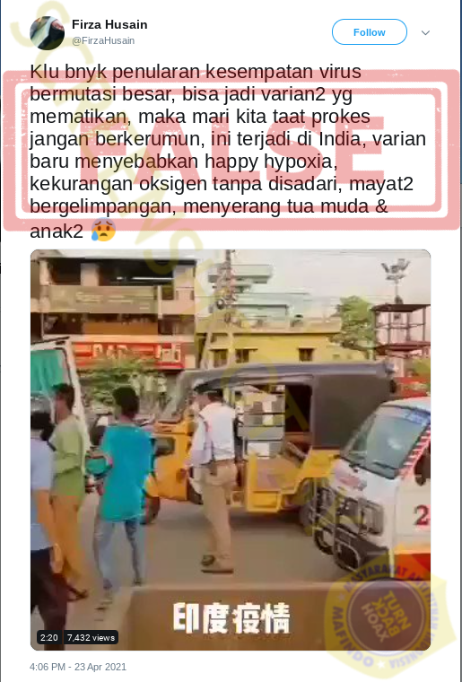 Beredar sebuah video pada akun twitter @FirzaHusain dengan Narasi “Klu bnyk penularan kesempatan virus bermutasi besar, bisa jadi varian2 yg mematikan, maka mari kita taat prokes jangan berkerumun, ini terjadi di India, varian baru menyebabkan happy hypoxia, kekurangan oksigen tanpa disadari, mayat2 bergelimpangan, menyerang tua muda & anak2 😰”.
