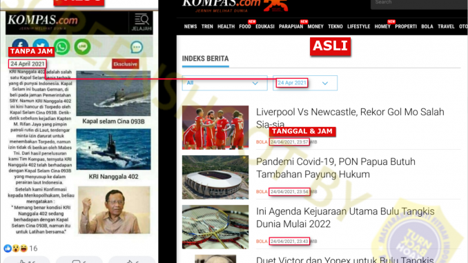 SUMBER membagikan Tangkapan layar PALSU yang mencatut KOMPAS.com. Indeks berita KOMPAS.com pada 24 April 2021. Terlihat bahwa artikel dipublikasikan dengan tanggal dan jam, TIDAK hanya tanggal seperti tangkapan layar PALSU oleh SUMBER.