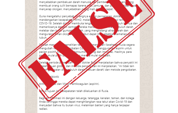 Beredar sebuah pesan berantai whatsapp yang menyebutkan bahwa covid-19 bukanlah virus melainkan bakteri yang terpapar radiasi radiasi dan menggumpal melalui darah hingga menyebabkan kematian.