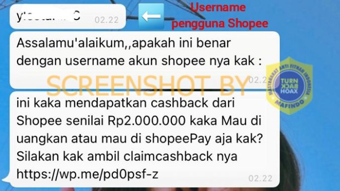 Belum lama ini, sempat beredar pesan melalui WhatsApp yang mengatasnamakan Shopee terkait pemberian cashback kepada pengguna Shopee senilai Rp2 juta dengan cara melakukan klaim cashback pada sebuah link yang dikirimkan oleh pihak yang mengaku sebagai pegawai resmi Shopee.
