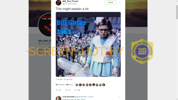 Akun Twitter 404_Not_Found (@4_04_Not_Found) mengunggah cuitan berupa foto yang diklaimnya sebagai foto Bill Gates tahun 1963. Cuitan tersebut mendapat atensi berupa 46 balasan, 82 retweet, dan 209 suka.