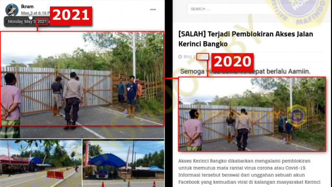 TIDAK berkaitan dengan larangan mudik 2021. FAKTANYA, foto yang dibagikan sudah beredar sebelumnya pada tahun lalu (2020). Hoaks yang sempat viral di daerah Kerinci dan Merangin yang setelah diperiksa langsung ke lapangan oleh aparat yang terkait terbukti SALAH.