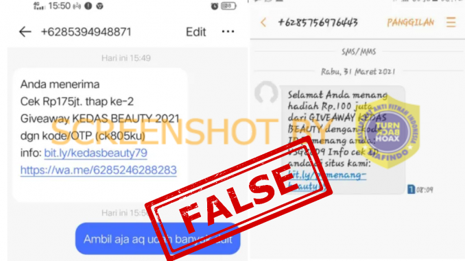 Telah beredar sebuah SMS yang mengabarkan perihal giveaway dari sebuah merek produk kecantikan, Kedas Beauty. SMS giveaway 100 juta rupiah ini akan masuk dengan memberikan sebuah kode pin untuk penerima pesan, serta mengarahkan penerima pesan tersebut untuk masuk ke sebuah tautan yang tertera.