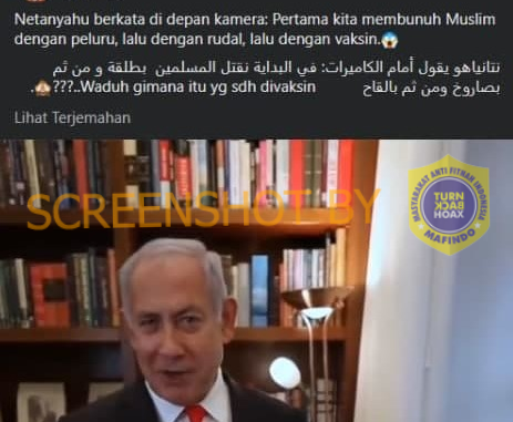 Beredar sebuah narasi dalam unggahan Facebook oleh akun Bekam Totok Kiropraksi Paz yang mengatakan bahwa Benjamin Netanyahu, yakni Perdana Menteri Israel akan membunuh Muslim dengan vaksin. Dalam unggahan tersebut juga memuat sebuah video yang memperlihatkan Netanyahu sedang berbicara di hadapan kamera yang diklaim memiliki arti bahwa Netanyahu akan membunuh Muslim dengan peluru, rudal, lalu dengan vaksin.