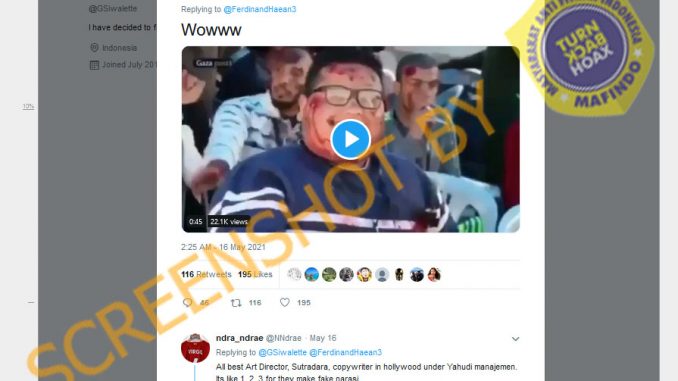 Beredar postingan berupa video di Twitter oleh akun @Gsiwalette. Video tersebut menampilkan sejumlah warga Palestina yang sedang dirias wajahnya untuk membuat tampilan luka-luka berdarah di area wajah. Beberapa tata rias terlihat mencampurkan bahan make up berwarna merah untuk membuat tampilan berdarah. Dalam videonya juga terdapat narasi bahwa warga Palestina sengaja memalsukan luka di tubuh mereka agar dunia merasa kasihan dan agar Israel dipandang buruk.