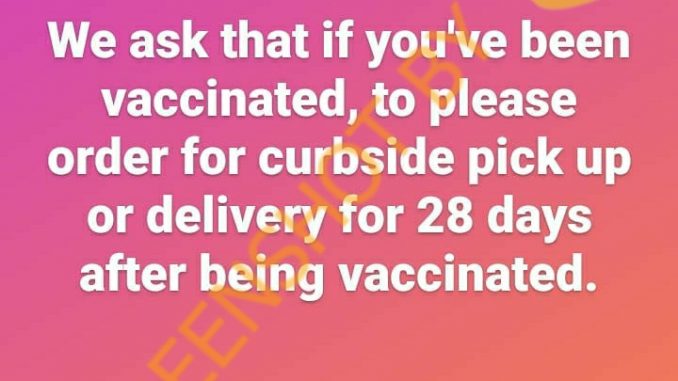 “After reading the effects of side effects for those that or arround people who have been vaccinated as described by pfizer in their study trials and after consulty a doctor as well, we ask that if you’ve been vaccinated, to please order for curbsid pick up or delivery for 28 days after their vaccinated…”