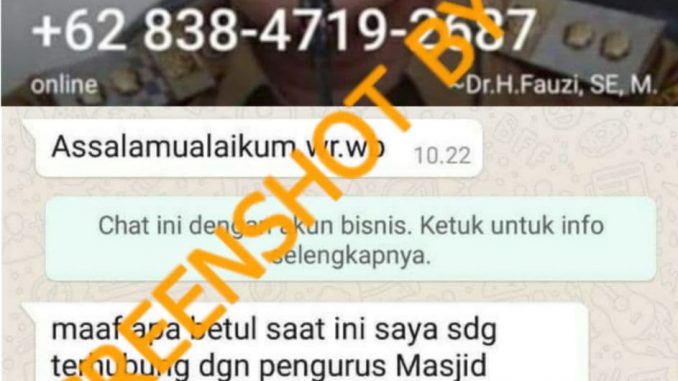 Beredar akun WhatsApp Wakil Bupati Pringsewu, Fauzi. Akun yang menggunakan foto profil serta nama Fauzi tersebut melakukan komunikasi ke sejumlah pengurus rumah ibadah guna meminta sejumlah dana terkait pembagian donasi dari Pemerintah Kabupaten Pringsewu.