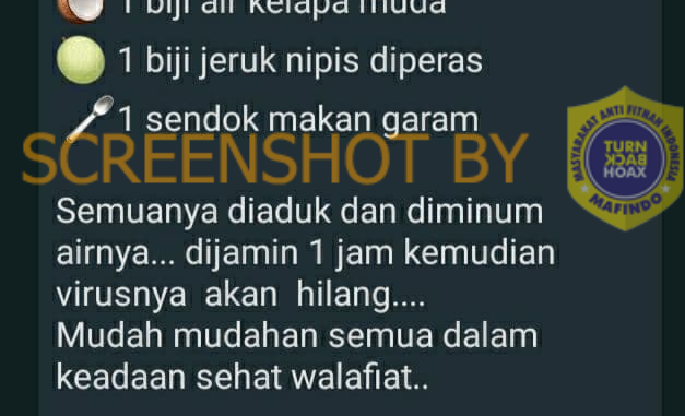 Beredar sebuah pesan berantai melalui Whatsapp yang mengatakan bahwa campuran air kelapa, jeruk nipis dan garam dapat menyembuhkan Covid-19. Pesan tersebut juga mengatakan bahwa jika campuran tersebut diminum maka virus Covid-19 akan hilang dalam satu jam.