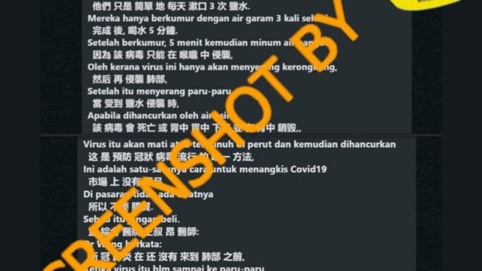 Beredar sebuah pesan berantai melalui WhatsApp yang menyatakan bahwa terjadi penurunan jumlah pasien Covid-19 di Tiongkok karena warganya rajin berkumur dengan air garam 3 kali sehari, dilanjutkan dengan meminum air hangat. Dalam pesan tersebut juga disebutkan bahwa kandungan dalam air asin akan menghancurkan virus Corona yang berada di dalam perut.