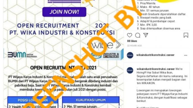 Berdasarkan hasil penelusuran, akun tersebut bukan merupakan akun Instagram milik PT WIKA Industri & Konstruksi. Melalui situs resminya, wikaikon.co.id, PT WIKA Industri & Konstruksi menegaskan bahwa seluruh lowongan kerja hanya dipublikasikan melalui situs resmi perusahaan, yaitu wikaikon.co.id/karir-wikaikon.