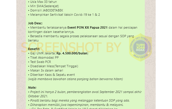 Berdasarkan penelusuran, Ketua 2 PB PON, Roi Letlora setelah dihubungi pewarta membantah adanya lowongan tersebut.