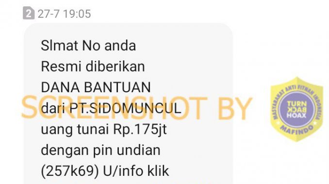 Beredar SMS PT Sido Muncul memberikan dana bantuan sebesar 175 juta yang disertai link untuk info lebih lanjut.