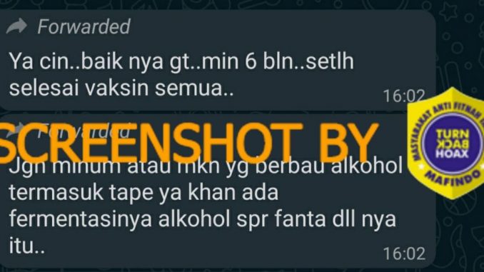 Beredar sebuah pesan melalui WhatsApp yang menyarankan untuk tidak mengonsumsi makanan dan minuman yang mengandung alkohol seperti tape serta minuman bersoda seperti Fanta setidaknya hingga 6 bulan setelah menerima kedua dosis vaksin Covid-19.