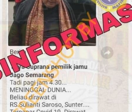 Hasil Periksa Fakta Novita Kusuma Wardhani (Institut Ilmu Sosial dan Ilmu Politik (IISIP) Jakarta). Informasi tersebut salah. Faktanya melansir dari www.rmoldkijakarta.id, istri dari Jaya Suprana menampik kebenaran informasi tersebut.