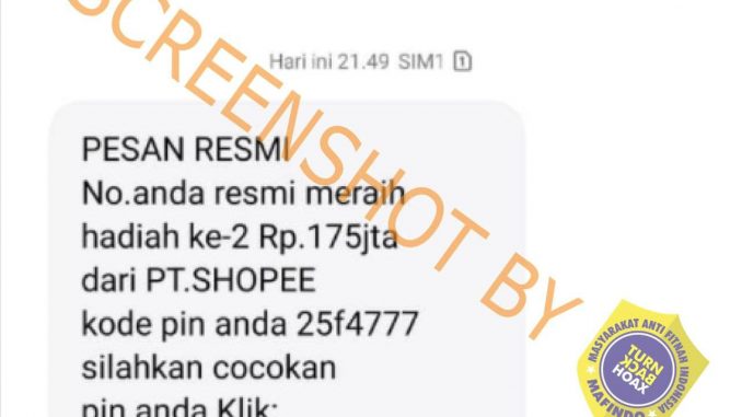 Telah beredar sebuah pesan singkat (SMS) yang berisikan pengumuman pembagian hadiah sebesar Rp175 Juta mengatasnamakan Shopee. Dalam pesan tersebut terdapat link dan juga pin pemenang.