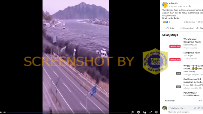 Akun Facebook Ali Malik mengunggah video yang diklaim sebagai peristiwa meluapnya bendungan ngarai di China yang menyebabkan banjir bandang pada 2 Agustus 2021. Video yang diunggah pada 9 Agustus 2021 itu telah ditonton sebanyak 139 kali dan mendapat atensi berupa 6 reaksi serta 2 komentar.