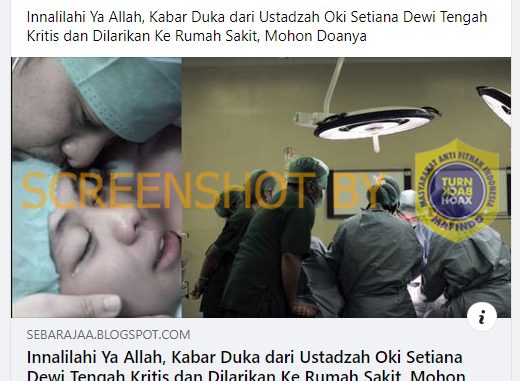 Beredar postingan akun Facebook Raihan Muhammad Ramdani pada 21 Agustus 2021 yang menyatakan bahwa Ustazah Oki Setiana Dewi tengah kritis dan dilarikan ke rumah sakit. Postingan itu menyertai tautan yang mengarah kepada artikel berjudul “Innalilahi Ya Allah, Kabar Duka dari Ustadzah Oki Setiana Dewi Tengah Kritis dan Dilarikan Ke Rumah Sakit, Mohon Doanya” di sebarajaa[dot]blogspot[dot]com yang tayang pada 21 Agustus 2021.