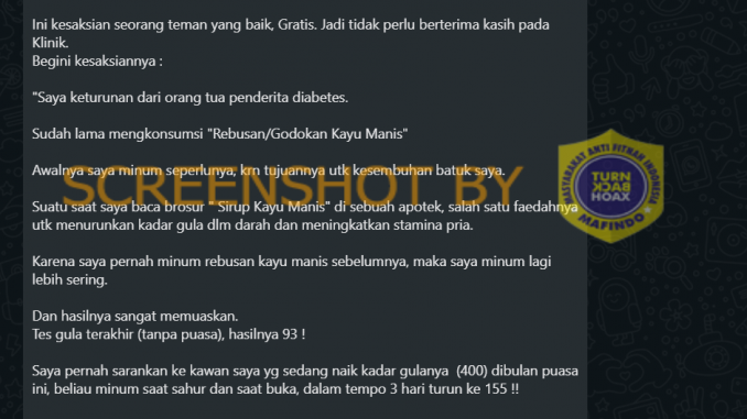 Telah beredar pesan di WhatsApp yang menginformasikan bahwa meminum rebusan kayu manis dapat menurunkan kadar gula darah. Dalam pesan tersebut juga, diberikan cara pembuatan rebusan kayu manis dan jumlah konsumsinya dalam sehari.