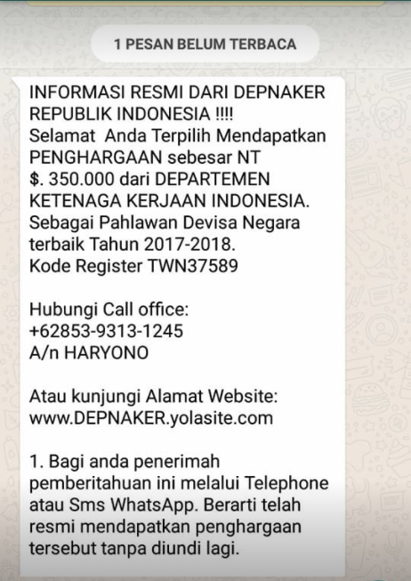 Pesan berantai beredar di kalangan pekerja migran Indonesia (PMI) di Hongkong yang mengklaim dari Departemen Ketenagakerjaan Indonesia. Pesan itu berisikan informasi undian berhadiah sebesar NT$350 ribu.