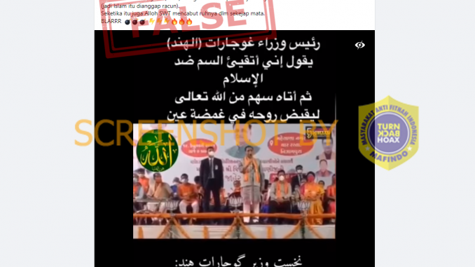 Berdasarkan hasil penelusuran, adanya video yang diklaim sebagai Perdana Menteri Gujarat, India yang meninggal dunia saat menganggap Islam adalah racun saat berpidato adalah klaim yang salah.