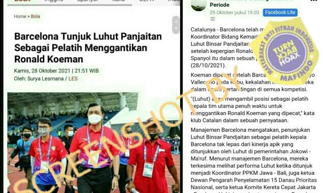 Beredar postingan di Facebook oleh akun bernama Rahmat Joan di grup “Dukung Jokowi 3 Periode”. Dalam postingannya disertakan sebuah screenshoot artikel berita berjudul “Barcelona Tunjuk Luhut Panjaitan Sebagai Pelatih Menggantikan Ronald Koeman”, terdapat juga foto Menteri Koordinator Bidang Kemaritiman dan Investasi, Luhut Binsar Pandjaitan sedang berjalan di sebuah stadion.