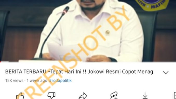 Beberapa waktu lalu, telah beredar sebuah video di Facebook yang menuliskan judul dengan klaim bahwa Presiden Joko Widodo atau Jokowi telah resmi mencopot Menteri Agama (Menag), Yaqut Cholil Quomas atau akrab disapa Yaqut. Sampai saat ini, video yang disebarkan kembali oleh akun Facebook Persaudaraan telah ditonton sebanyak 15 ribu kali di sumber aslinya di Youtube.
