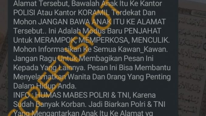 Beberapa waktu lalu sempat beredar informasi melalui pesan WhatsApp yang dikatakan berasal dari Humas Mabes Polri dan TNI mengenai modus terbaru dari oknum yang berniat untuk melakukan perampokan, pemerkosaan, dan penculikan. Pada pesan berantai yang beredar itupun dinyatakan bahwa modus tersebut dilakukan dengan melibatkan anak kecil yang ditugaskan untuk menangis dan meminta kepada seseorang untuk mengantarkannya pulang ke alamat yang anak kecil tersebut tunjukkan.