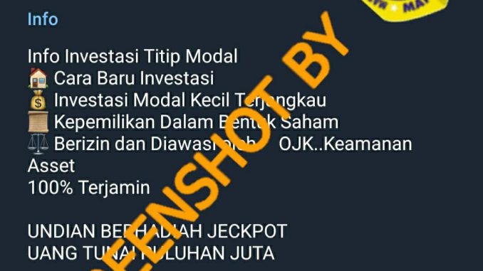 Beredar sebuah akun Telegram dengan nama pengguna “INVESTOR | BANK INDONESIA” (https://t.me/jhghjkkjhg). Akun tersebut menggunakan logo Bank Indonesia sebagai foto profil dan menawarkan investasi kepada para anggotanya. Akun tersebut telah memiliki 61.823 orang anggota.