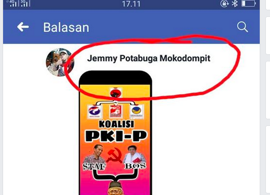 “Koalisi PKI – P,” tulis akun Facebook Jemmy Potabuga Mokodompit yang dibagikan akun Facebook Joko Anas, Selasa (1/1).