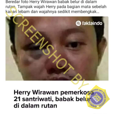 Beredar sebuah informasi di media sosial Facebook yang menunjukkan foto Herry Wirawan pelaku pemerkosa 21 santriwati, babak belur. Luka lebam dalam foto tersebut diklaim sebagai luka lebam akibat babak belur di dalam rutan. Diketahui saat ini, Herry Wirawan ditahan di Rutan Kelas 1A Kebon Waru Bandung.