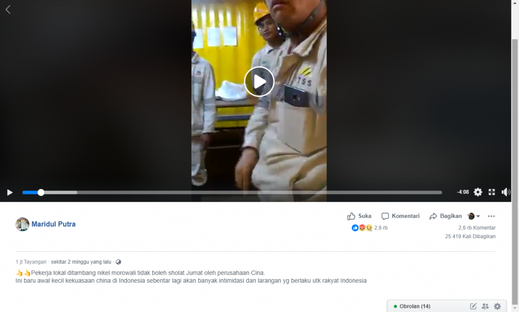 Narasi : “:Pekerja lokal ditambang nikel morowali tidak boleh sholat Jumat oleh perusahaan Cina.