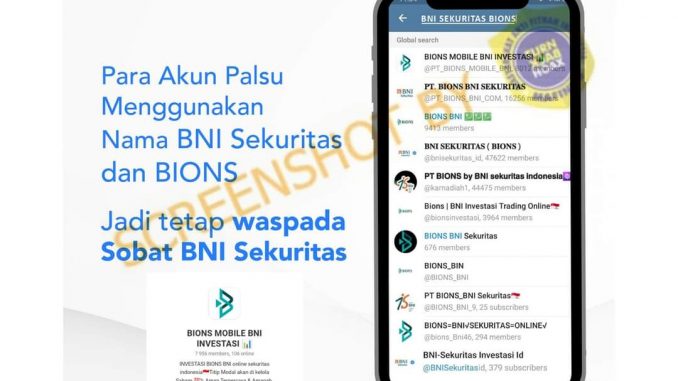 Beredar beberapa akun Telegram dengan nama pengguna “BIONS MOBILE BNI INVESTASI” (https://t.me/PT_BIONS_MOBILE_BNI) atau BNI Sekuritas. Akun tersebut menggunakan logo BNI Sekuritas sebagai foto profil dan menawarkan investasi kepada para anggotanya. Akun tersebut telah memiliki 7 ribu lebih anggota.