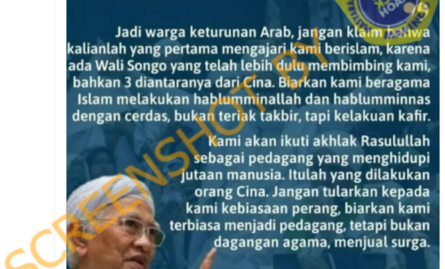 Akun Twitter Aiming (@PeopleBuilder21) mengunggah cuitan berupa foto kutipan dari KH. Mustofa Bisri (Gus Mus) yang berisi pesan kepada warga keturunan Arab untuk tidak mengklaim sebagai kelompok pertama yang mengajari cara berislam. Cuitan tersebut diunggahnya pada 28 Desember 2021.