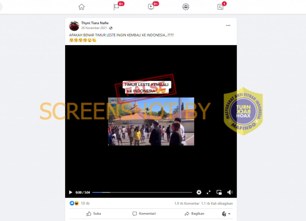 Akun Facebook Thyni Tiara Nafie (fb.com/defne.tiara) pada 26 November 2021 mengunggah sebuah video dengan narasi “APAKAH BENAR TIMUR LESTE INGIN KEMBALI KE INDONESIA,,,????”