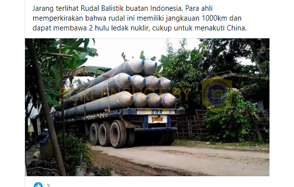 Akun Facebook bernama Merdeka Saptatih mengunggah postingan berupa foto yang memperlihatkan sebuah truk yang melewati pemukiman warga sedang membawa benda-benda berukuran besar. Akun tersebut lantas mengklaim bahwa benda tersebut adalah rudal balistik buatan Indonesia yang memiliki jangkauan 1000km dan membawa 2 hulu ledak nuklir serta cukup untuk menakuti China.