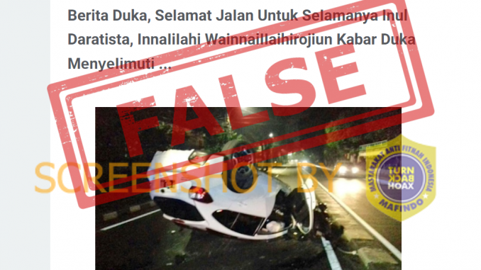 Beredar artikel berjudul “Berita Duka, SeIamat JaIan Untuk SeIamanya Inul Daratista, InnaIiIahi WainnaiIIaihirojiun Kabar Dukа MеnуеIіmutі …” yang tayang di situs seputarberita[dot]xyz. Artikel juga memuat foto sebuah mobil berwarna putih dalam kondisi terbalik di jalan raya.