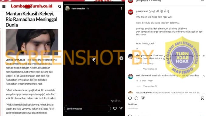 Beberapa waktu lalu sempat beredar informasi terkait meninggalnya salah satu selebgram asal Indonesia bernama Rio Ramadhan yang tersebar di berbagai platform media sosial, salah satunya ialah akun Instagram bernama @gossipnesia. Akun tersebut mengunggah foto dan juga video yang menjelaskan tentang menninggalnya Rio Ramadhan dengan disertai ucapan turut berduka cita yang tertera pada caption unggahan akun tersebut.