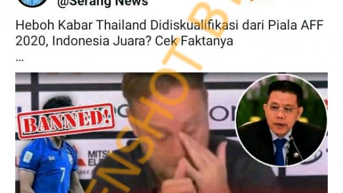 Beredar sebuah narasi di media sosial Facebook dengan klaim yang menyebutkan bahwa Thailand telah didiskualifikasi dari kejuaraan Piala AFF karena salah satu pemain diketahui memakai doping. Dalam narasi ini pun dikatakan bahwa Indonesia kembali memiliki kesempatan bertanding karena laga leg 1 akan diulang. Unggahan oleh akun grup Facebook INFO TIMNAS INDONESIA 2022 ini menampilkan pula hasil tangkapan layar dari sebuah aku Youtube dengan klaim yang sama.