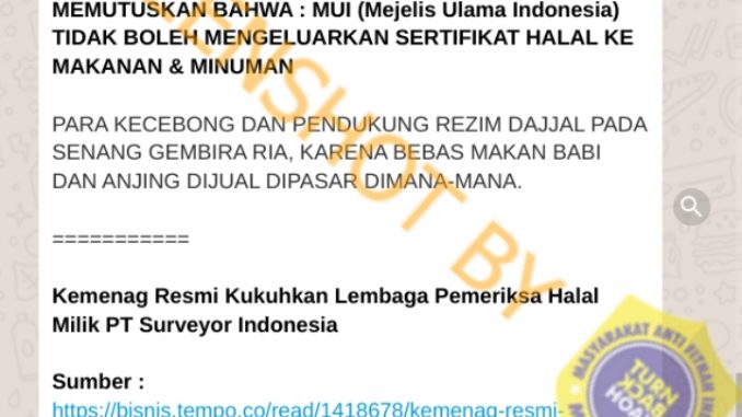 Beredar sebuah narasi melalui pesan Whatsapp yang mengatakan bahwa MUI tidak boleh mengeluarkan sertifikat halal untuk makanan dan minuman. Narasi tersebut mengatakan bahwa keputusan MUI tidak boleh mengeluarkan sertifikat halal merupakan keputusan Menteri Agama, Yaqut Cholil Qoumas. Narasi pada pesan singkat Whatsapp tersebut juga mencantumkan artikel berita dari laman berita Tempo dengan judul “Kemenag Resmi Kukuhkan Lembaga Pemeriksa Halal Milik PT Surveyor Indonesia”.