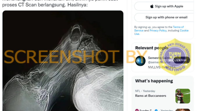 Akun Twitter Semesta Sains (@semestasains) mengunggah cuitan berupa foto hasil CT scan dari pasien penderita claustrophobia (ketakutan pada ruang tertutup/sempit) yang panik saat proses pengambilan gambar. Cuitan yang diunggah pada 24 Januari 2022 itu mendapat atensi berupa 341 retweet dan 2.636 suka.