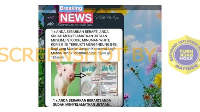 Beredar pesan berantai di WhatsApp yang menyatakan bahwa minuman kopi serbuk “White Koffie” mengandung babi. Selain itu, terdapat himbauan bagi kaum Muslim untuk tidak mengonsumsi minuman tersebut dan menyebarkan kembali pesan berantai itu.