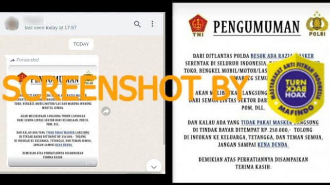 Beredar sebuah pesan berantai melalui WhatsApp yang menyatakan bahwa akan dilaksanakan razia masker oleh Ditlantas Polda secara serentak di seluruh Indonesia. Dalam pesan tersebut juga dicantumkan logo TNI dan Polri, serta jumlah denda yang akan diberikan kepada pihak yang tidak menggunakan masker, yaitu Rp250 ribu.