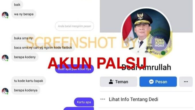 Beredar akun Facebook Wakil Walikota Bandar Lampung Deddy Amarullah. Akun tersebut menggunakan foto profil Deddy Amarullah memakai pakaian dinas, dengan nama profil “Dedi Amrullah”. Terlihat akun tersebut juga mengirimkan pesan kepada pengguna Facebook untuk meminta nomor Whatsapp, lalu diminta untuk mengirimkan kode verifikasi Whatsapp.