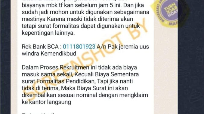 Dengan demikian lowongan kerja di Disdik Kota Bogor yang beredar melalui pesan Whatsapp adalah salah dan masuk dalam kategori konten tiruan.