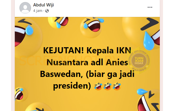 Akun Facebook bernama Abdul Wiji mengunggah sebuah narasi yang mengklaim bahwa Anies Baswedan menjadi Kepala Otorita Pembangunan Ibu Kota Baru IKN Nusantara. Dalam narasinya juga disebutkan bahwa pemilihan Anies sebagai kepala IKN agar Anies tidak jadi Presiden pada Pilpres 2024 nanti.