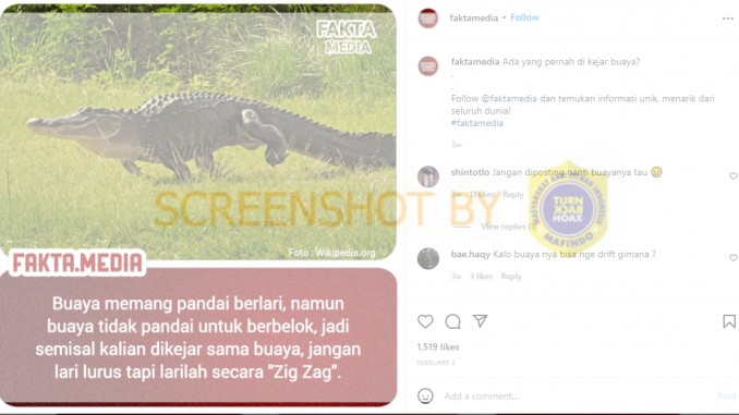Beredar sebuah unggahan foto di akun Instagram @fakta.media yang memuat sebuah anjuran untuk berlari zigzag apabila dikejar oleh buaya karena buaya tidak dapat berbelok meski pandai berlari.