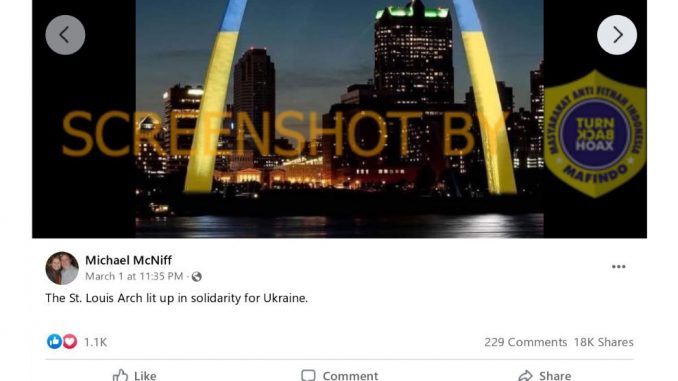 Akun Facebook Michael McNiff mengunggah foto lengkungan St. Louis atau St. Louis Arch yang terlihat menyala dengan warna biru dan kuning, seperti bendera Ukraina. Foto tersebut diklaim sebagai bentuk dukungan dan solidaritas untuk Ukraina.