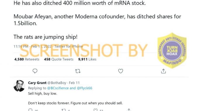 Akun Twitter @BCscifience menulis cuitan pada 11 Februari lalu bahwa CEO Moderna, Stéphane Bancel, telah menghapus akun Twitternya dan menjual saham Moderna senilai 400 juta dolar AS. Selain itu, co-founder Moderna bernama Moubar Afeyan juga diklaim telah menjual asetnya seharga 1,5 miliar dolar AS.