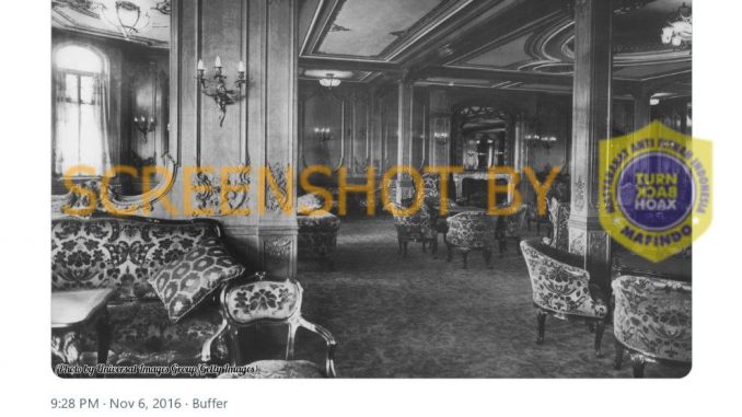 Akun Twitter @HistoryInPics menulis cuitan pada 6 November 2016, yang memperlihatkan foto monokrom ruang tunggu utama di dalam sebuah kapal, yang diklaim sebagai kapal Titanic. Foto tersebut juga diklaim diambil pada tahun 1912. Unggahan tersebut telah disukai hampir 2000 pengguna Twitter dan dibagikan ulang sebanyak 630 kali.